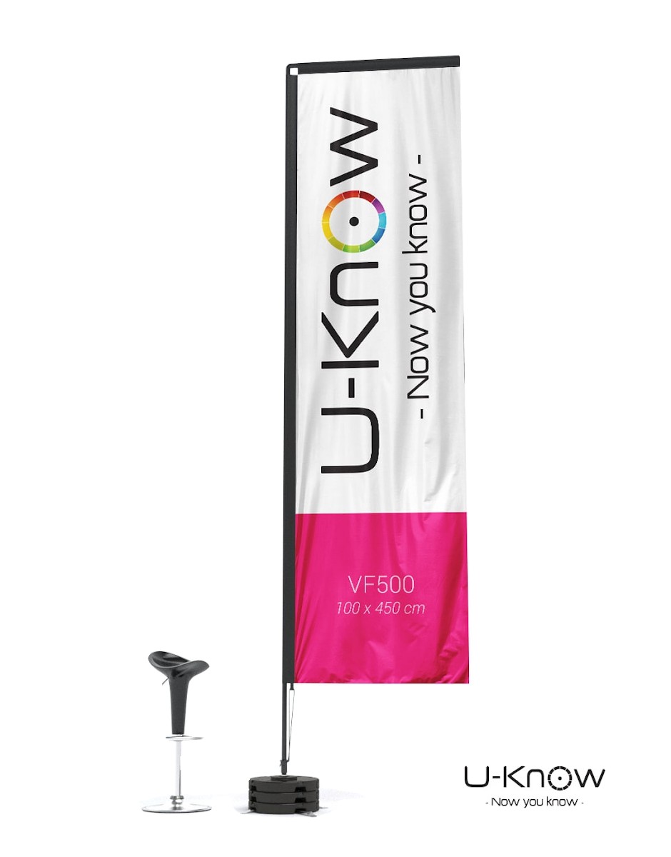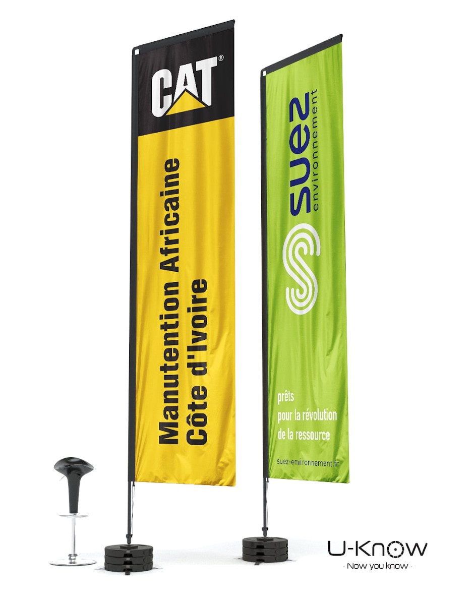 Beach flag en H ou rectangulaire de 5m de hauteur. Voile oriflamme en matière 100% polyester 115g/m². Seule une impression recto seule est possible. L'impression est réalisée en quadri numérique et visible au verso par transparence. Le fourreau noir de la voile est renforcé et fabriqué dans un polyester Oxford 300 D. Le mât est en fibre de carbone (très résistant). Le mât se fixe sur le croisillon acier monté sur un axe de rotation spécial à roulement à billes MATP90. Il convient de lester avec au moins 2 socles PVC Béton sans axe de rotation (réf:MATP31) pour obtenir une bonne résistance aux vents pour ces oriflammes géantes. Utilisation extérieure exclusivement. Garanti pour un vent inférieur à 70 km/h..Structure disponible sur stock dans notre entrepôt parisien, impression réalisée après validation de la commande