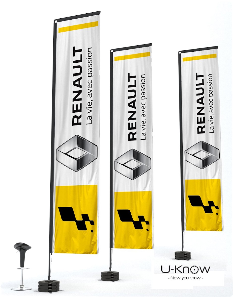 Beach flag en H ou rectangulaire de 6m de hauteur. Voile oriflamme en matière 100% polyester 115g/m². Seule une impression recto seule est possible. L'impression est réalisée en quadri numérique et visible au verso par transparence. Le fourreau noir de la voile est renforcé et fabriqué dans un polyester Oxford 300 D. Le mât est en fibre de carbone (très résistant). Le mât se fixe sur le croisillon acier monté sur un axe de rotation spécial à roulement à billes MATP90. Il convient de lester avec au moins 3 socles PVC Béton sans axe de rotation (réf:MATP31) pour obtenir une bonne résistance aux vents pour ces oriflammes géantes. Utilisation extérieure exclusivement. Garanti pour un vent inférieur à 70 km/h..Structure disponible sur stock dans notre entrepôt parisien, impression réalisée après validation de la commande