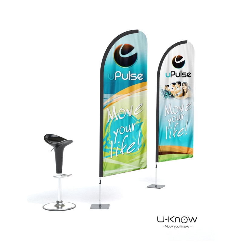 Beach flag plume / aile d'avion classique de 1,4m de hauteur. Voile oriflamme en matière 100% polyester 115g/m². 2 techniques d'impressions possibles : numérique ou sérigraphique (MOQ de 50 pcs en sérigraphie). En impression recto seul, le visuel est visible sur l'autre côté par transparence. En impression numérique, il est possible d'imprimer en recto/verso ; une feuille occultante insérée entre les deux côtés permet d'avoir une meilleure lisbilité. Le fourreau noir de la voile est renforcé et fabriqué dans un polyester Oxford 300 D. Le mât est en fibre de verre (très résistant). Les mâts se fixent sur tous les pieds de la même manière. L'axe de rotation présent sur les pieds pivote à 360°. Les voiles se tendent sur tous les mâts grâce à un élastique. Utilisation intérieure exclusivement..Structure disponible sur stock dans notre entrepôt parisien, impression réalisée après validation de la commande