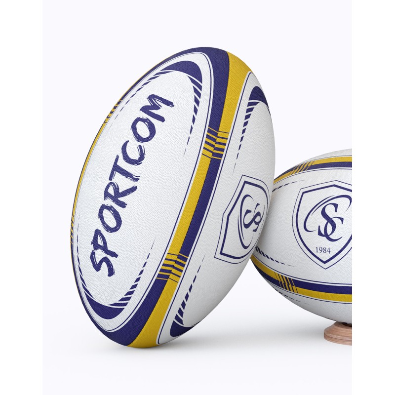 Ballon de rugby Training 100% personnalisé en taille 5 officielle. Revêtement en caoutchouc vulcanisé à picots. Poids : 380-400g. Revêtement extérieur antiglisse. Cousu main 4 panneaux. Vessie latex synthéthique. Personnalisation intégrale en sérigraphie (6 couleurs maximum). Ballon livré non gonflé sous polybag individuel. Aiguille en option. Minimum de commande : 50 pcs
